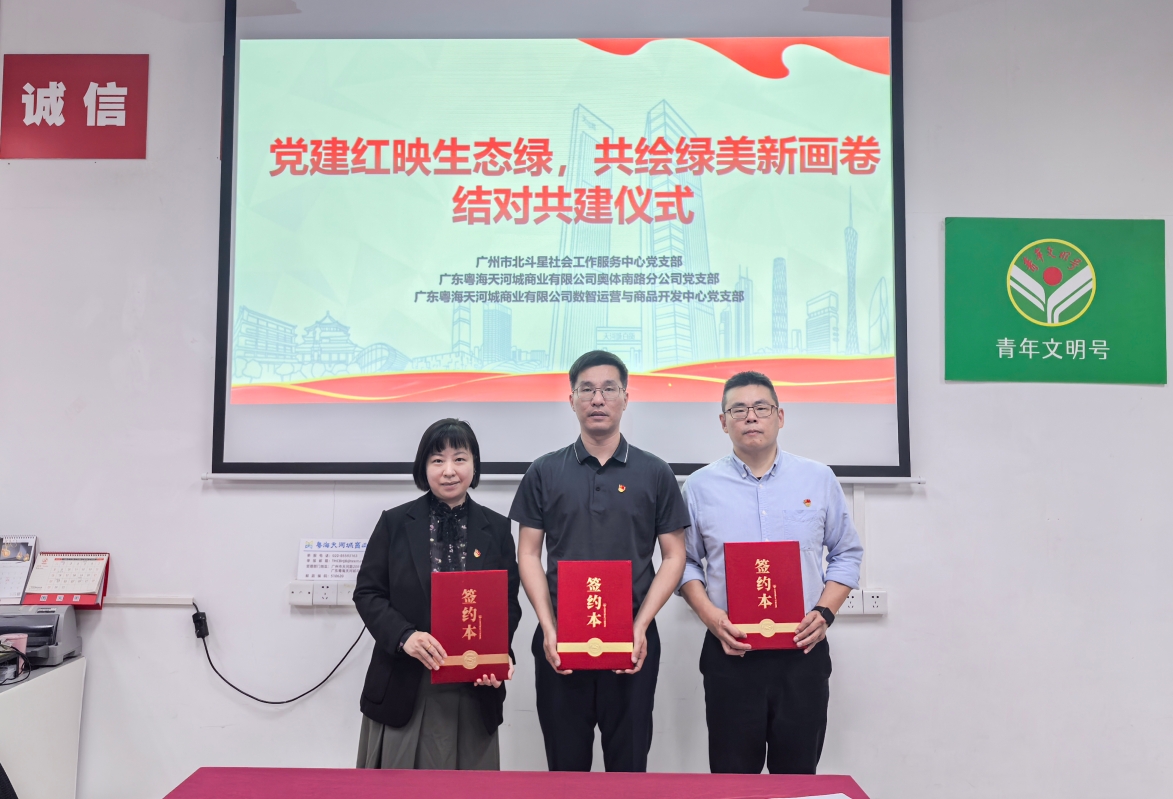 3月27日下午,广州市北斗星社会工作服务中心党支部(以下简称“北斗星党支部”)与广东粤海天河城商业有限公司奥体南路分公司党支部、广东粤海天河城商业有限公司数智运营与商品开发中心党支部在天河城奥莱奥体店共同开展党建共建签约仪式。北斗星党支部书记、理事长梁国勇,广东粤海天河城商业有限公司奥体南路分公司党支部书记、公司副总经理元文娴,广东粤海天河城商业有限公司数智运营与商品开发中心党支部书记陈慧洪出席本次仪式,并作为各方代表完成签约。