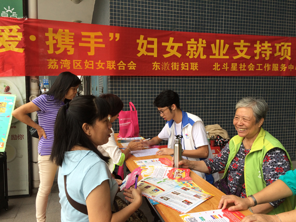 继上一期宣传活动结合招聘会现场进行宣传的成功,本次活动再一次借助中心与街道劳动保障部门合作举办的“荔湾区东漖街2016冬季‘零距离’招聘会”,把宣传摊位设于企业招聘摊位旁,向前来求职的居民进行宣传。现场吸引了不少居民前来求职,同时亦有较多的4050妇女因对妇女就业支持项目感兴趣而主动向宣传摊位咨询,愿意了解更多。而协助活动的长者义工们均以热情主动的态度向前来咨询的居民宣传“爱·携手”妇女就业支持项目以及中心的其他服务,耐心解答居民的疑惑。