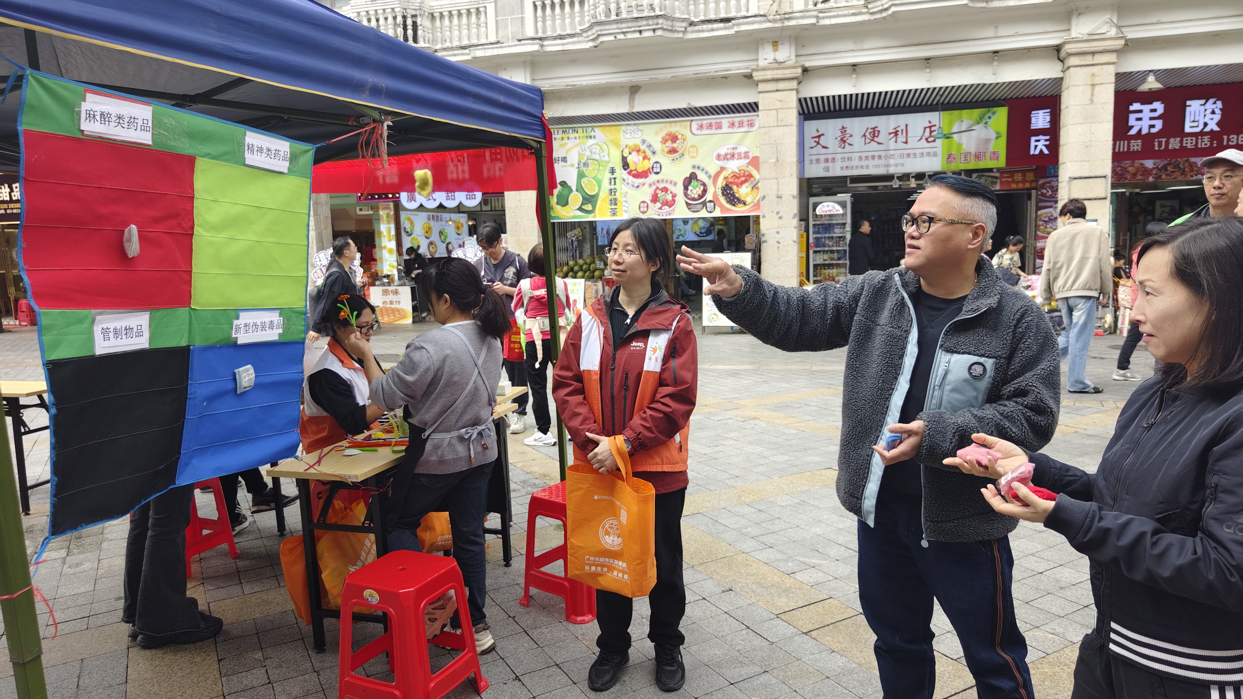 本次活动打破了传统的单向宣传模式,通过四大功能区实现“学习+体验+服务”的深度融合。在禁毒知识区,社工借助仿真毒品模型与资料讲解,为居民揭开麻精药品及新精神活性物质的“伪装外衣”,普及新型伪装毒品的识别技巧。趣味禁毒游戏区则将枯燥的知识转化为互动挑战,居民在投掷与问答中轻松掌握列管药物与成瘾性物质的防范知识。同时,义修服务区的同伴教育员和志愿者以实际行动践行“助人为乐”的奉献精神,传递邻里互助的温暖。