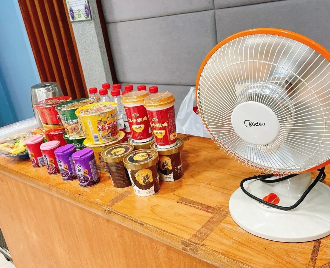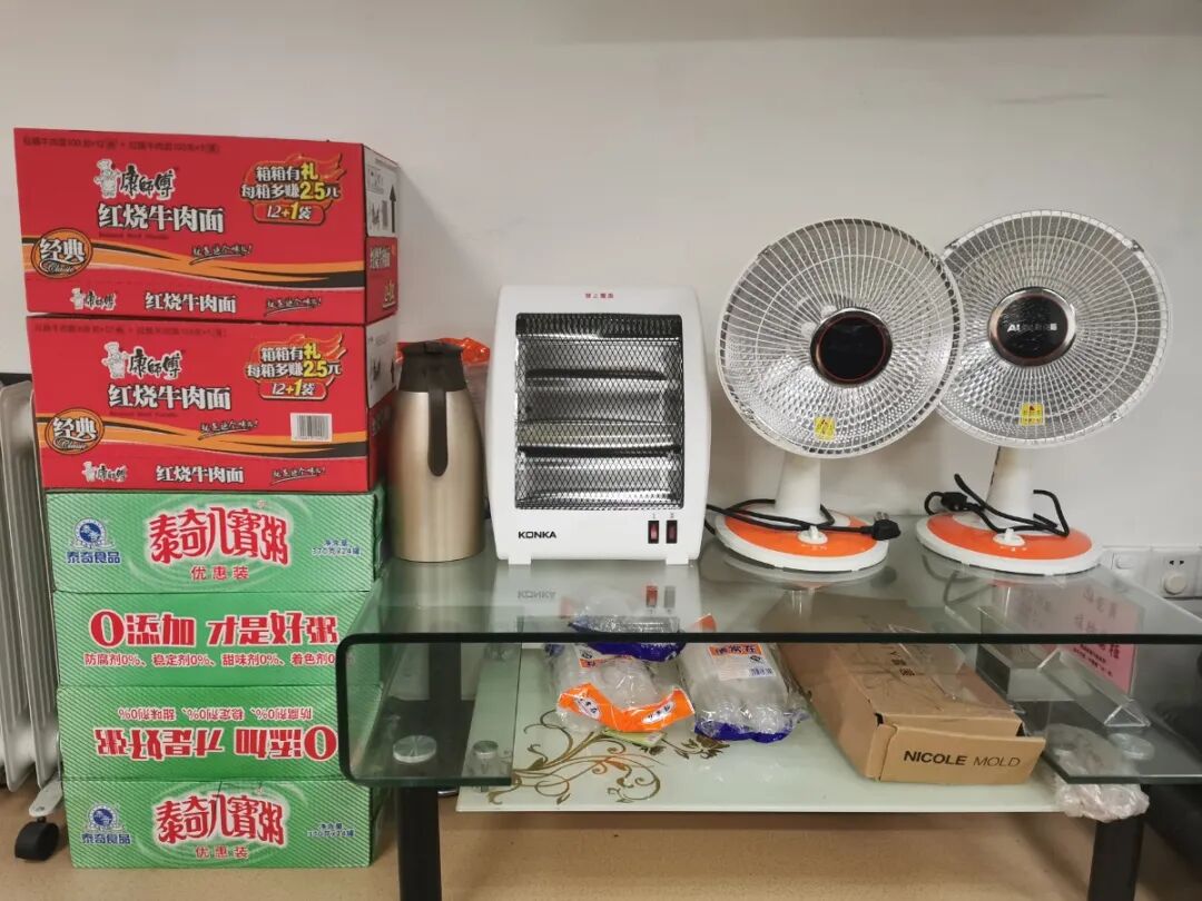 另外,社工站开放庇护床位20个,储备4箱96罐八宝粥和2箱24桶方便面,还准备了4个电暖扇和20双被褥以备居民之需。