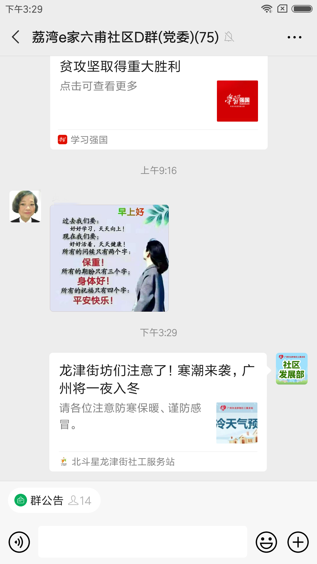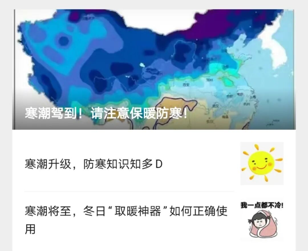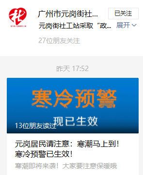 并通过元岗街社工服务站微信公众号提醒街坊居民密切关注寒潮天气变化等温馨提示。