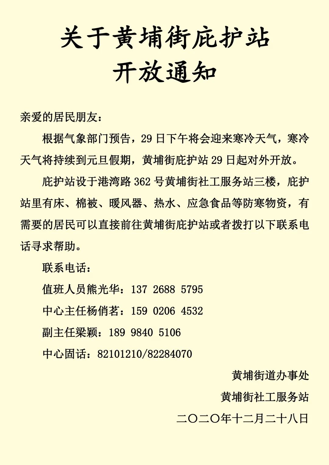 社工将开通24小时“红棉守护热线”服务,积极为广大市民提供防寒应急援助服务,有需要的市民可拨打居住地所属镇(街)社工服务站(点)的“红棉守护热线”。