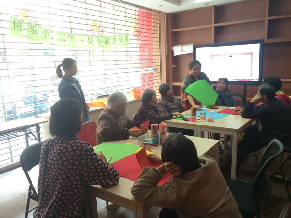活动过程中,社工先让长者进行自我介绍,包括介绍自己的一些兴趣爱好等;然后社工给兴趣相近的长者派发号码牌,并分在同一个小组活动(本次活动分两个小组)。接着社工让长者进行了你比我划的热身游戏,两个小组的长者在社工的带领下积极的投入到其中,让现场的气氛变得热烈起来。然后开始了贺卡的制作环节,很多长者表示自己没做过这个贺卡,不知道怎么做;然后社工耐心的给长者讲解制作的方法、鼓励她们动手尝试,长者们明白后都动手开始尝试制作,长者遇到不懂或者不会的都会及时的询问社工或者是其他长者。最后在长者们相互帮助以及社工的指导下,长者们都顺利的完成了一张贺卡的制作,然后长者们进行相互赠送。这次手工活动在愉悦的气氛中拉下帷幕,长者们纷纷表示,参加了这一次手工活动,感觉很开心,他们很满意,对社工的工作表示了肯定。