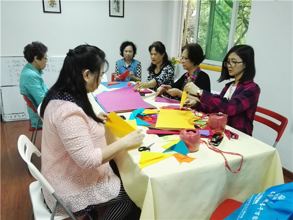 2016年1月-4月,为支持中心的探访服务,长者义工制作了一些手工作品,如:丝网花、不织布DIY挥春、头饰、挂饰等,参与到中心的探访服务中,为社区的长者送上关怀与祝福。2016年4月21日,长者义工在手工恒常活动的平台,通过DIY彩旗,装饰中心的活动场地,让我们的活动场地丰富起来。
