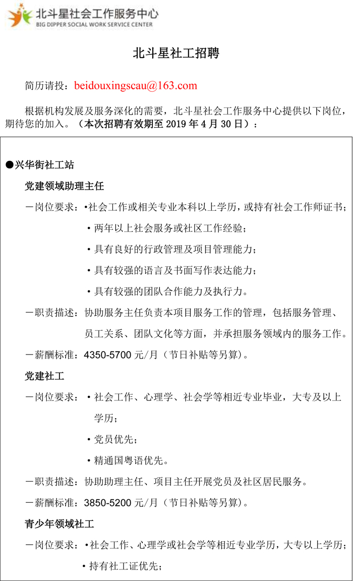 符合应聘人员资格条件者,请于 2019年4月30日前,将个人简历(请注明目前居住地)投到 :beidouxingscau@163.com(邮件及文件名称请命名为:姓名+应聘区域+应聘职位+可到岗日期)。经初审合适者,将以电子邮件方式收到面试通知。